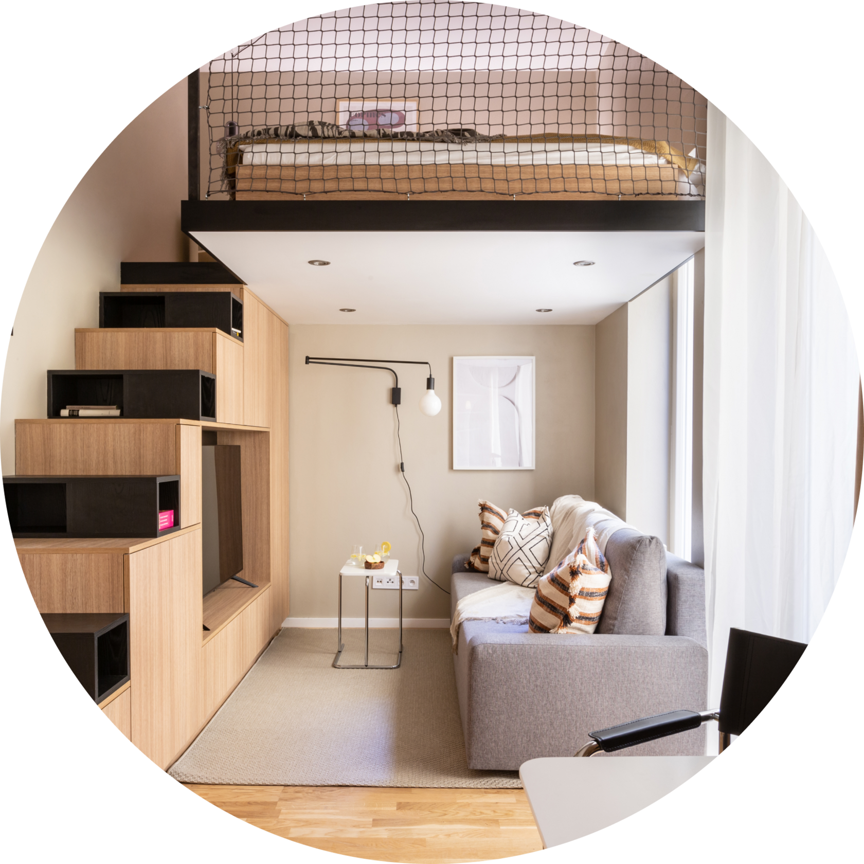 Útulný byt s kompaktním schodištěm vedoucím do druhého patra pro spaní - ideální řešení pro malé prostory.