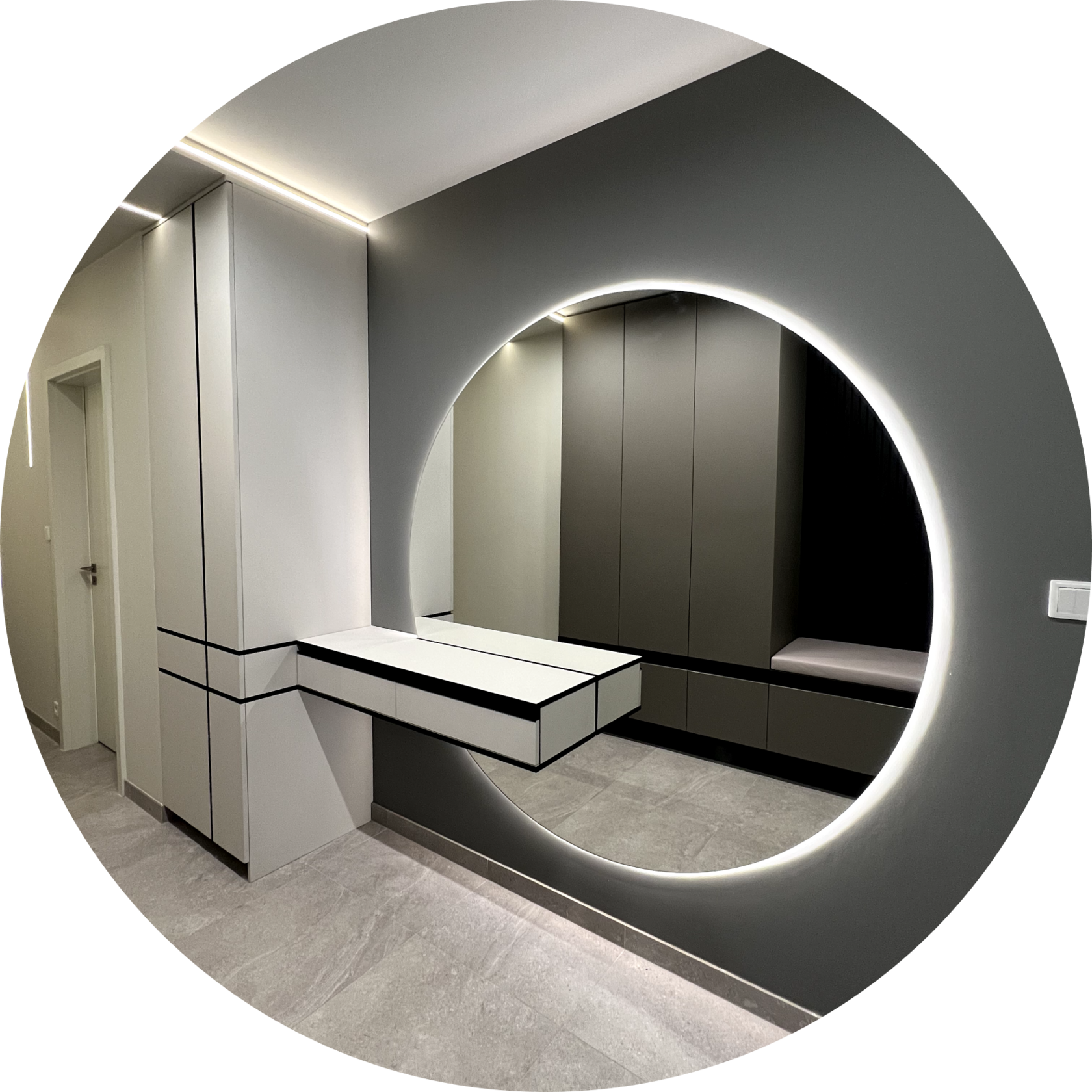 Úkolem bylo upevnit velké kulaté zrcadlo s LED podsvícením tak, aby vypadalo, že se vznáší ve vzduchu, a zároveň navazovalo na výsuvné šuplíky. Šuplíky měly být do poloviny zrcadla, a proto bylo nutné svařit vnitřní kovovou konstrukci pro pevnou oporu.Černé linie z výsuvných šuplíků pak přecházejí do frézovaných linií skříně