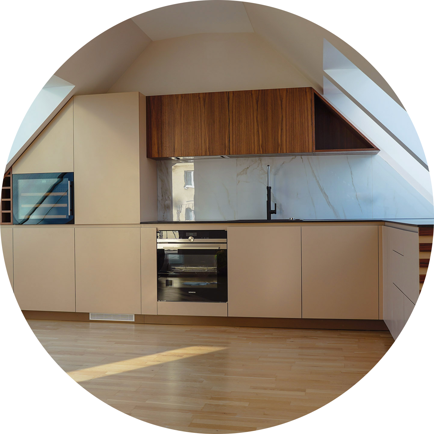 Stylová a elegantní, ale zároveň praktická kuchyně pro malý byt, kde je každý centimetr prostoru důležitý.Naléhavým přáním klienta bylo zakomponovat police z kompaktní desky pro vytvoření úložného prostoru na kuchyňské potřeby. Dalším požadavkem bylo, aby kuchyně byla světlá, ale zároveň obsahovala dřevěné prvky, které by ladily s podlahou. Pro dosažení tohoto efektu jsme použili hranu a zástěnu v dekoru dubu.
