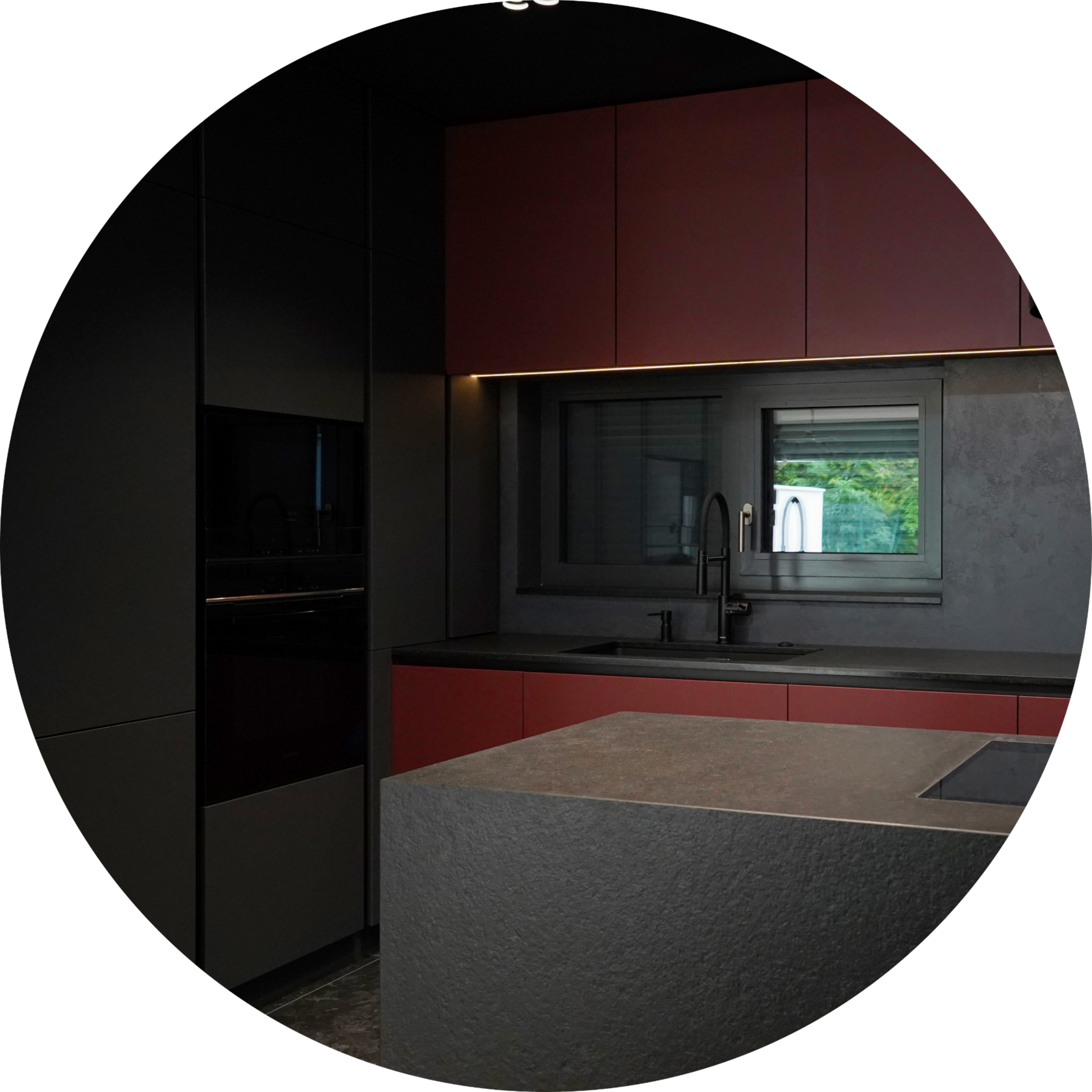 Vytvořili jsme harmonický a moderní design s důrazem na funkčnost a estetiku. V předsíni jsme instalovali elegantní kulaté zrcadlo s LED osvětlením, které vytváří příjemnou atmosféru a vizuální hloubku prostoru. Skříň v černém dekoru s integrovaným sedátkem dodává místnosti sofistikovaný vzhled a praktické využití. V obývacím pokoji jsme navrhli pevnou konstrukci pod sádrokartonem, která díky skrytým kabelům a čistým liniím vytváří jednotný a moderní vzhled. Kuchyň s ostrůvkem je kombinací burgundského a antracitového odstínu, s matným povrchem odolným proti otiskům prstů a žulovou pracovní deskou, což přináší eleganci a odolnost. V druhém patře jsme zařídili koupelnu a pokoj pro hosty tak, aby byly funkční a zároveň esteticky přitažlivé, s důrazem na skryté úložné prostory a moderní technologie. Ložnice je vybavena skříní s akrylovým povrchem, navrženou pro maximální úložný prostor a čistý design. Celý projekt jsme realizovali s ohledem na moderní trendy a potřeby našich klientů, přičemž jsme kladli důraz na detail a kvalitu zpracování.
